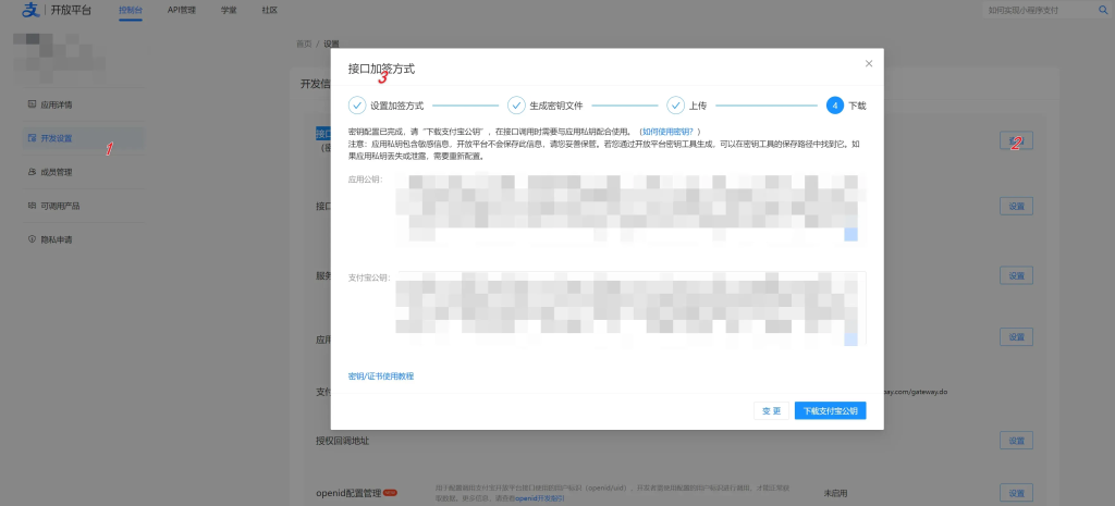3.打开开发设置选项,接口加签方式,按要求配置