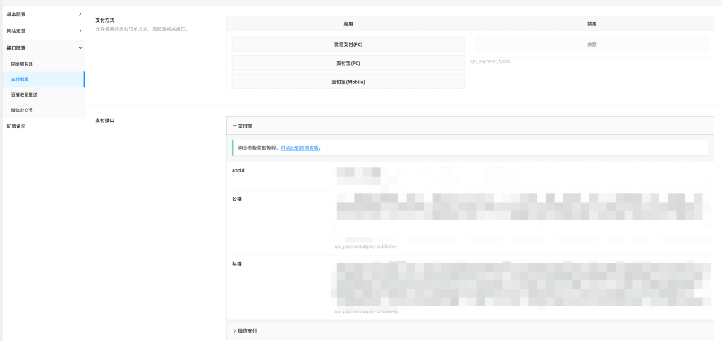 使用支付宝支付时,需要配置以下接口,相关配置项位于【接口配置】-【支付配置】-【支付宝】